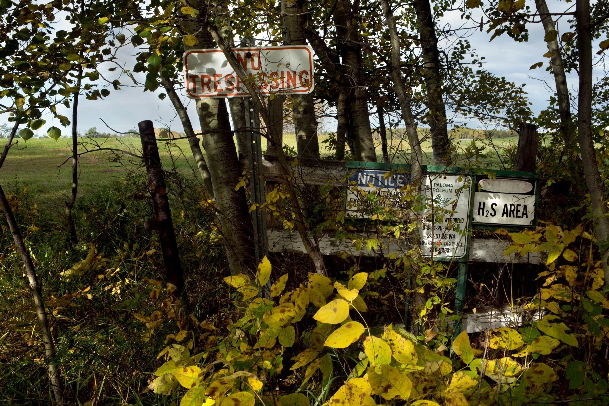 Signs warning about the danger of gas near a suspended and deactivated well in Devon, Alberta.