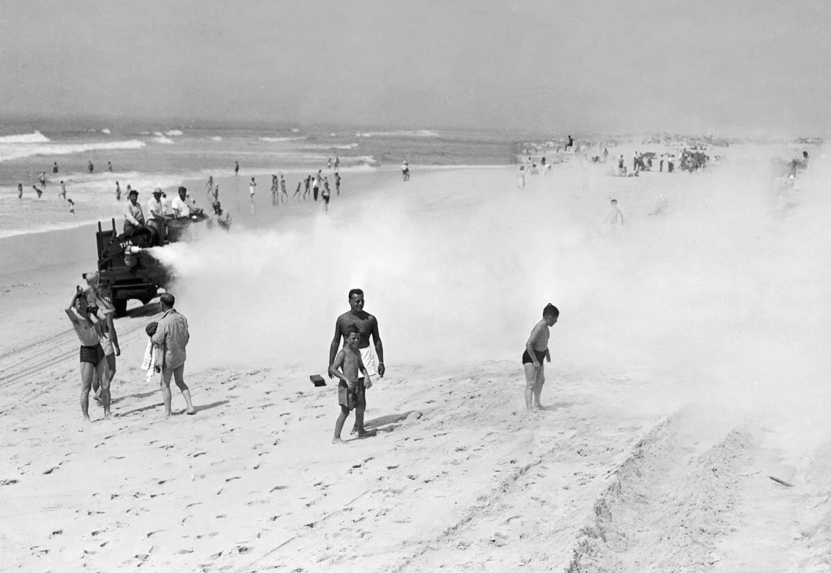 DDT was once considered a wonder pesticide, combatting malaria and preventing crop failures across the world. Top, a truck sprays DDT in 1945 to eliminate mosquitoes on Jones Beach on Long Island. Bottom, a plane dusts DDT powder on a flock of sheep in Medford, Ore., in 1948. (Keystone-France/Gamma-Keystone via Getty Images; Associated Press)