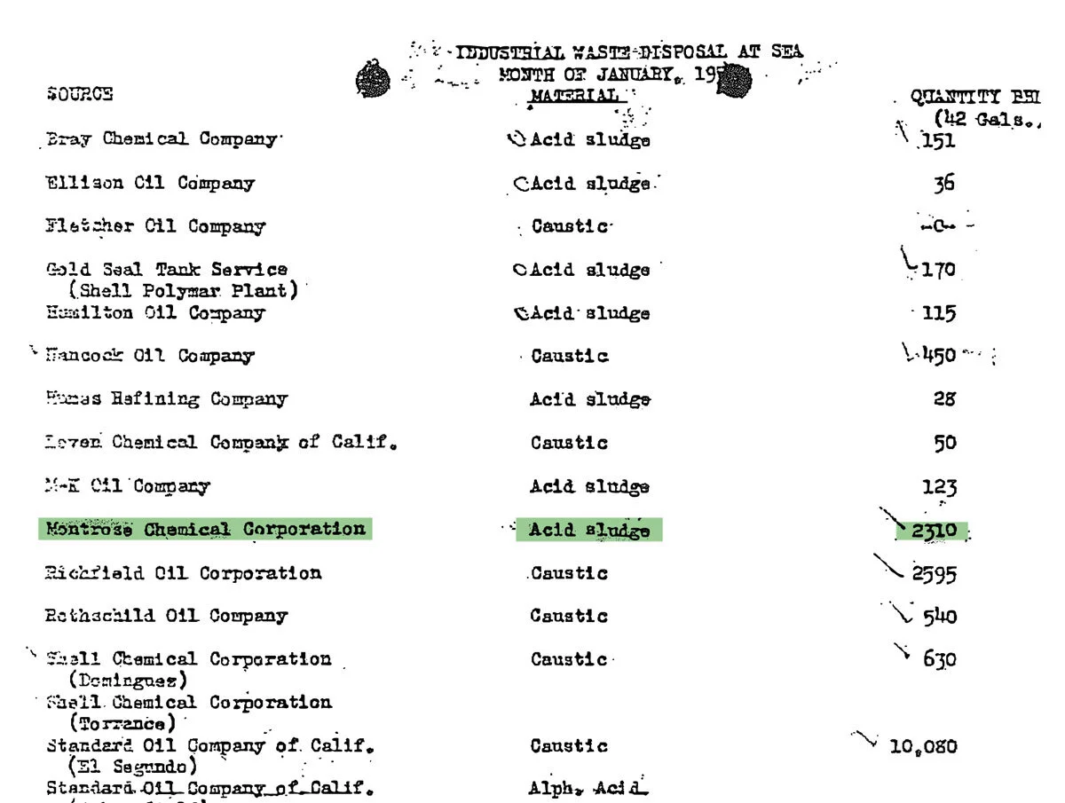 A 1958 shipping log shows that 2,310 barrels of “acid sludge” from Montrose Chemical Corporation were dumped in the ocean in the month of January.