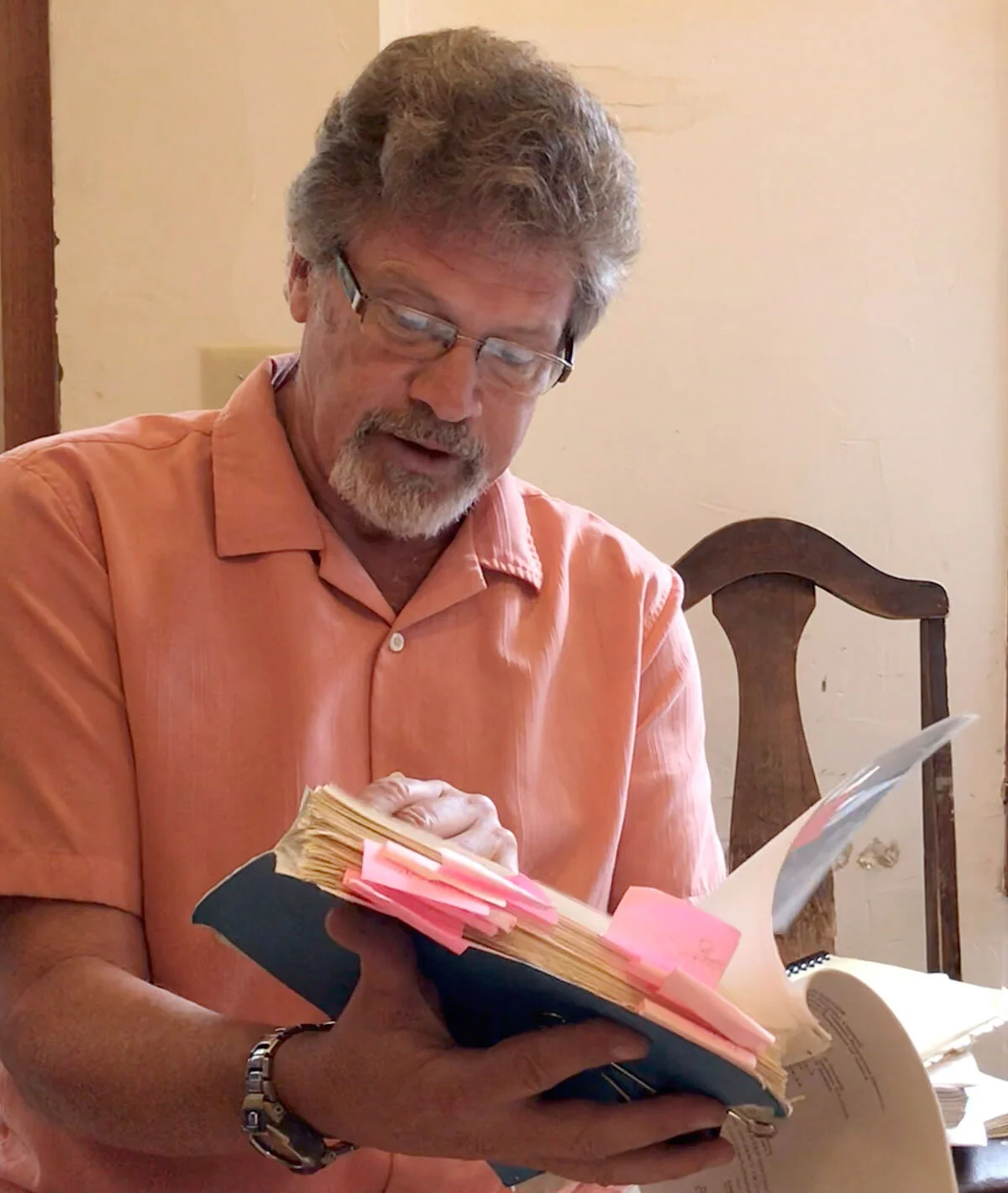 Allan Chartrand flips through old copies of his studies from the 1980s. (Rosanna Xia / Los Angeles Times)